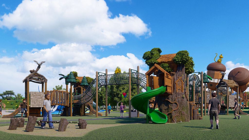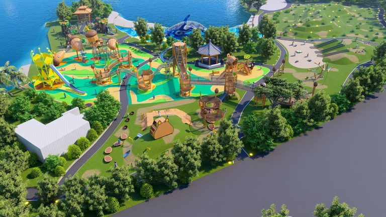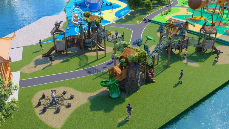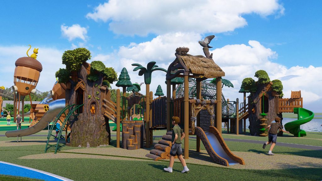 本项目以原生森林 + 萌趣松鼠为核心主题,打造集自然探索、体能锻炼、亲子互动、生态休闲于一体的全龄段户外儿童游乐空间。依托滨水生态环境,将树屋、松果、松鼠等森林元素与现代游乐设施深度融合,让孩子在沉浸式自然场景中释放天性、探索未知,成为城市亲子休闲与自然教育的标杆目的地。