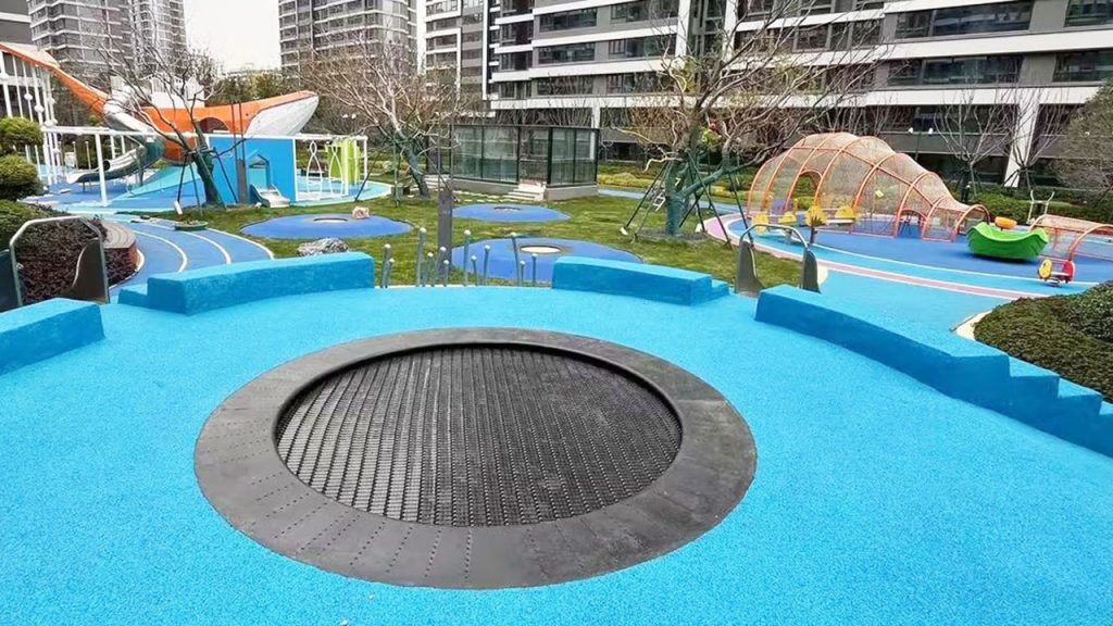 趣味互动设施:搭配蓝色环形秋千、黑色网格蹦床、木质平衡木与风车装置,萌趣外观与海洋主题呼应,低龄儿童可在蹦床上弹跳、在秋千上轻晃,感受 “海浪起伏” 的治愈感。